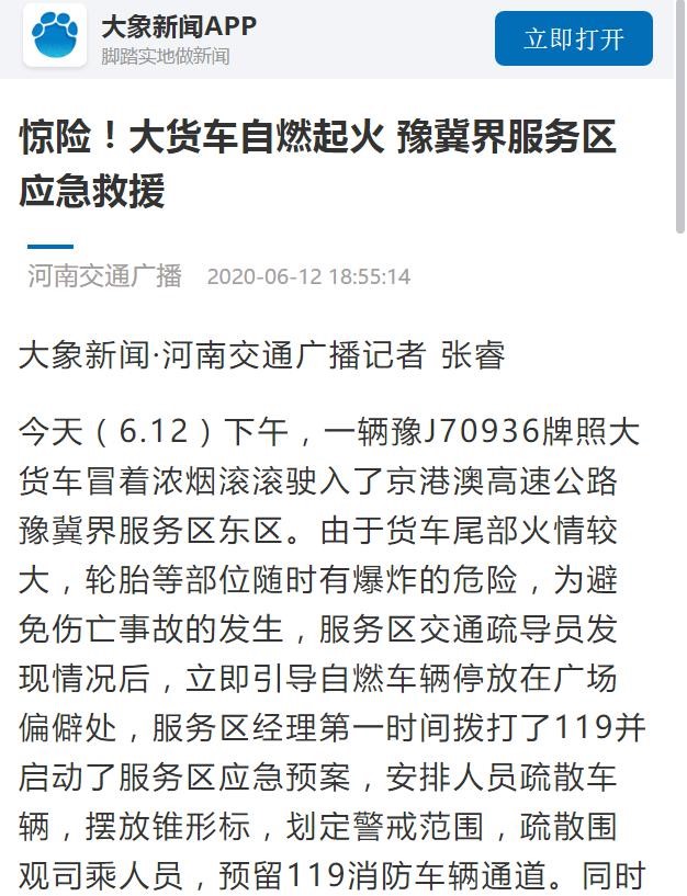 河南交通廣播以題為《驚險!大貨車自燃起火 豫冀界服務(wù)區(qū)應(yīng)急救援》在大象新聞、今日頭條對豫冀界服務(wù)區(qū)應(yīng)急救援進行了報道